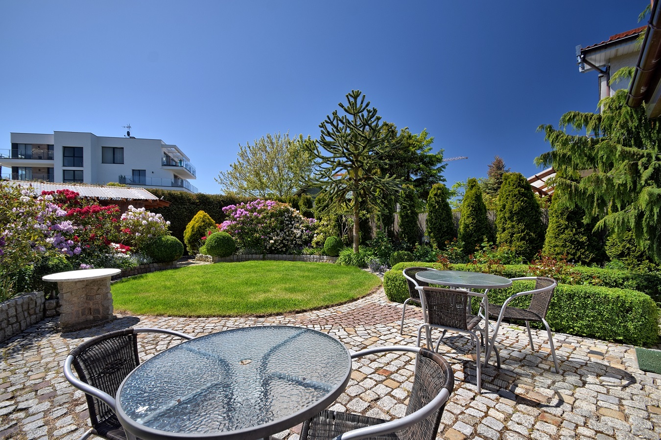 Dla chętnych na kąpiele słoneczne, w najlepiej nasłoneczniej części ogrodu czekają wygodne leżaki. Dzieci mogą się bezpiecznie bawić na ogrodzonym trawniku, zlokalizowanym w części rekreacyjnej ogrodu.